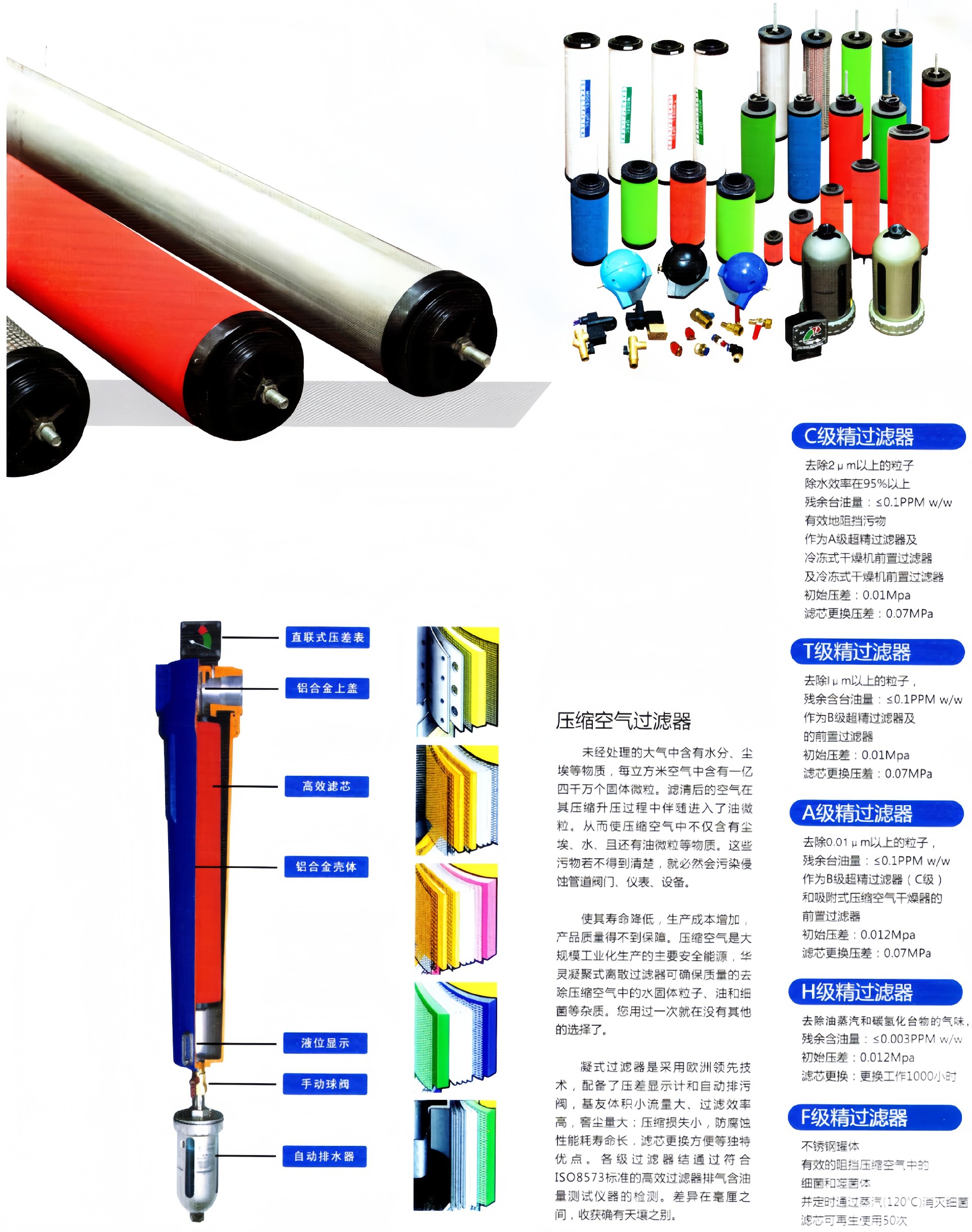 适用于聚结细小的水汽和油雾;可滤除小至0.01微米的凝聚物(0.01ppmw/w较大残留油分含量)
